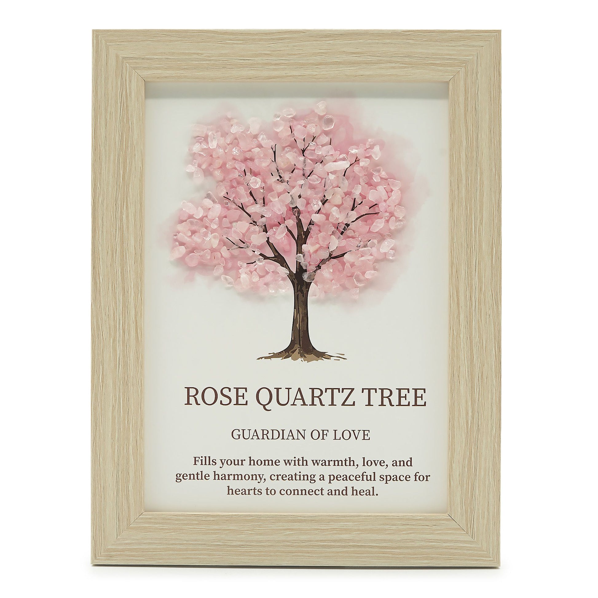 A delicate Tree of Life picture featuring genuine rose quartz gemstone chips, symbolising love, compassion, and emotional harmony. The soft pink crystals form a blooming tree canopy, creating a calming decorative piece that brings warmth and gentle energy into any room.